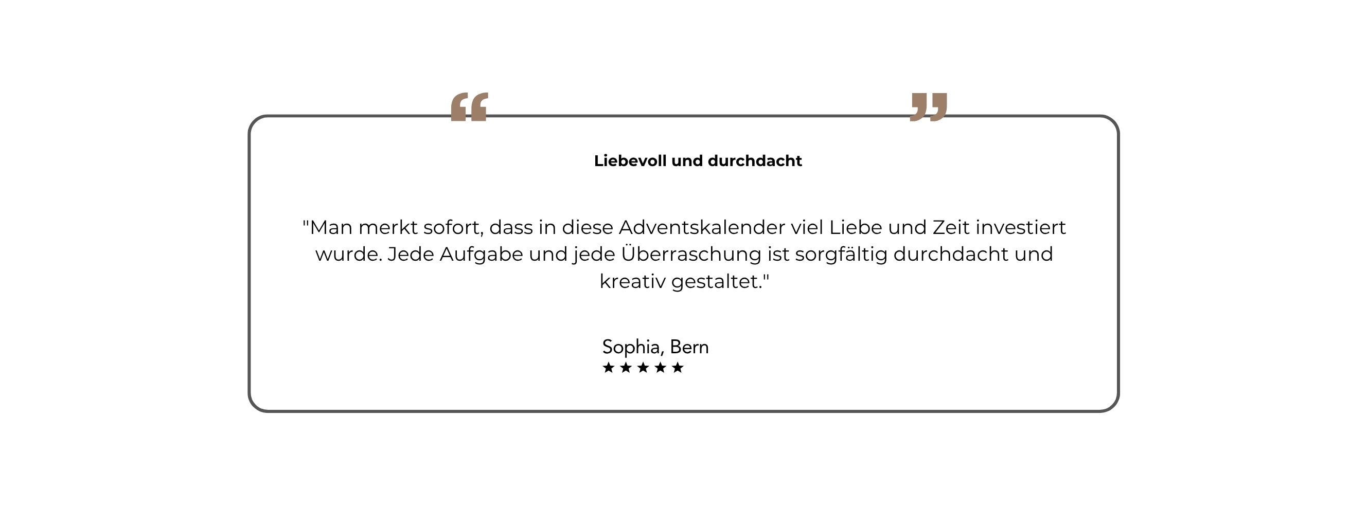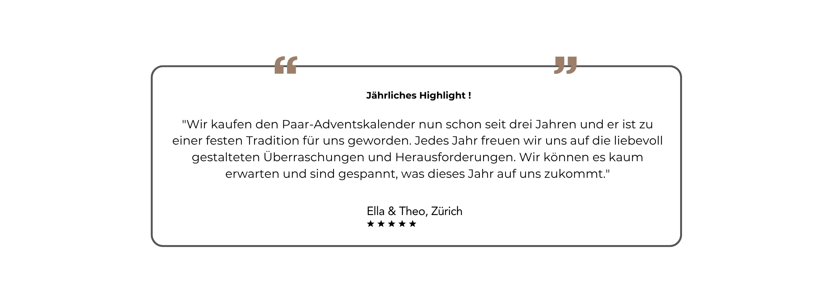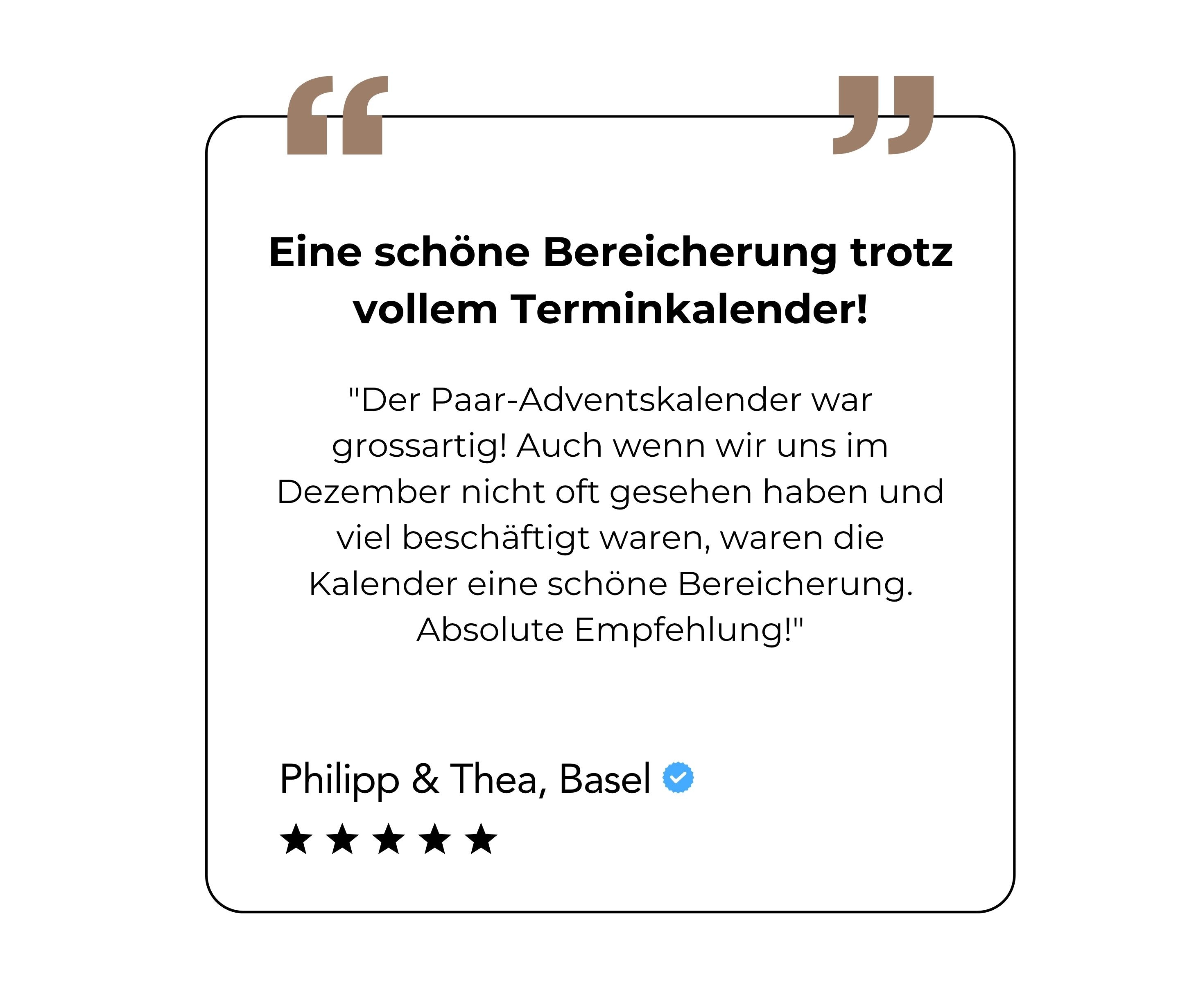 Der Paar-Adventskalender ist so konzipiert, dass die wichtigsten Dinge bereits organisiert sind. Ein kleiner Aufwand, aber eine grosse Wirkung. Unser Motto: Entspannt durch die Weihnachtszeit – riesige Freude bereiten.