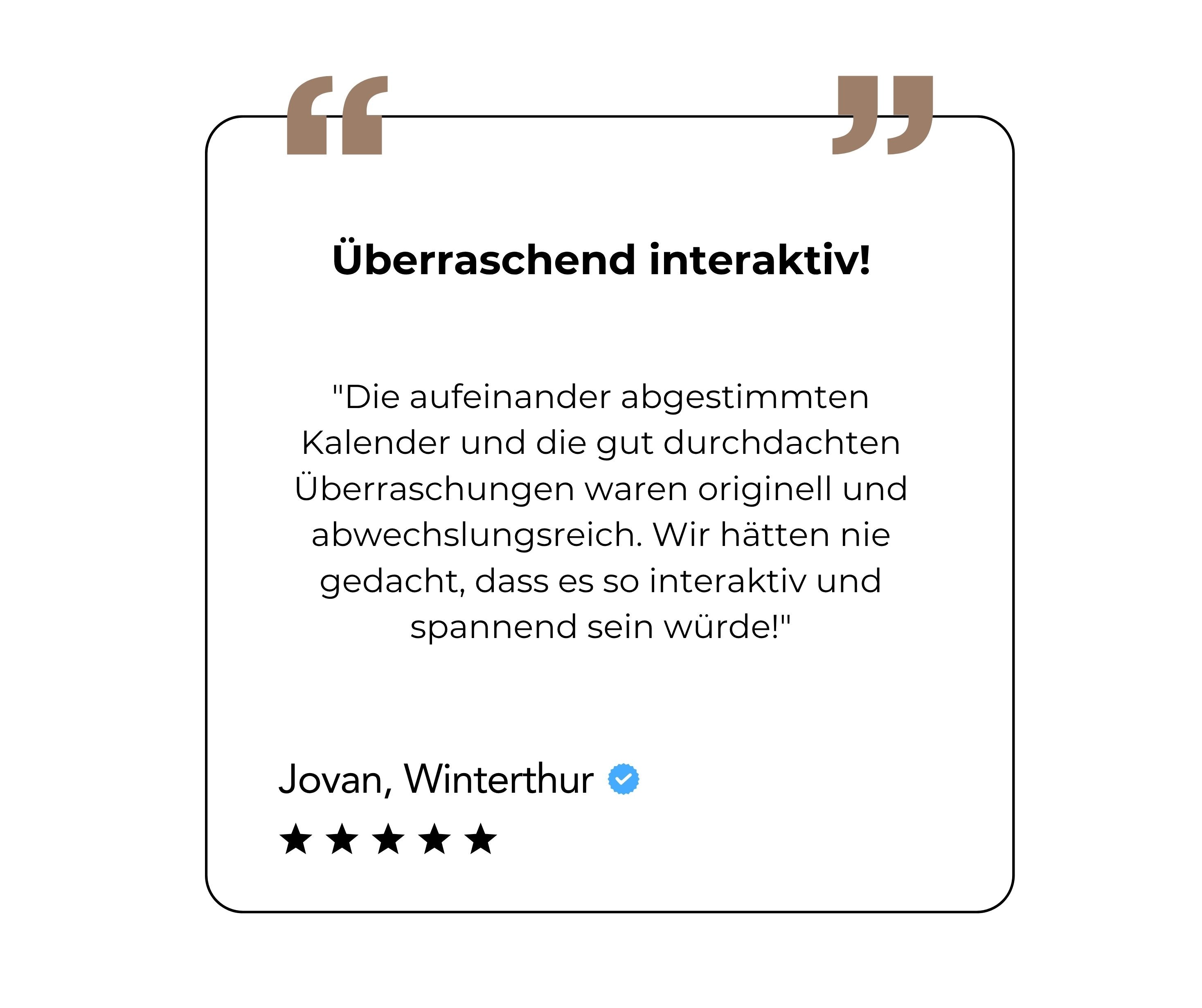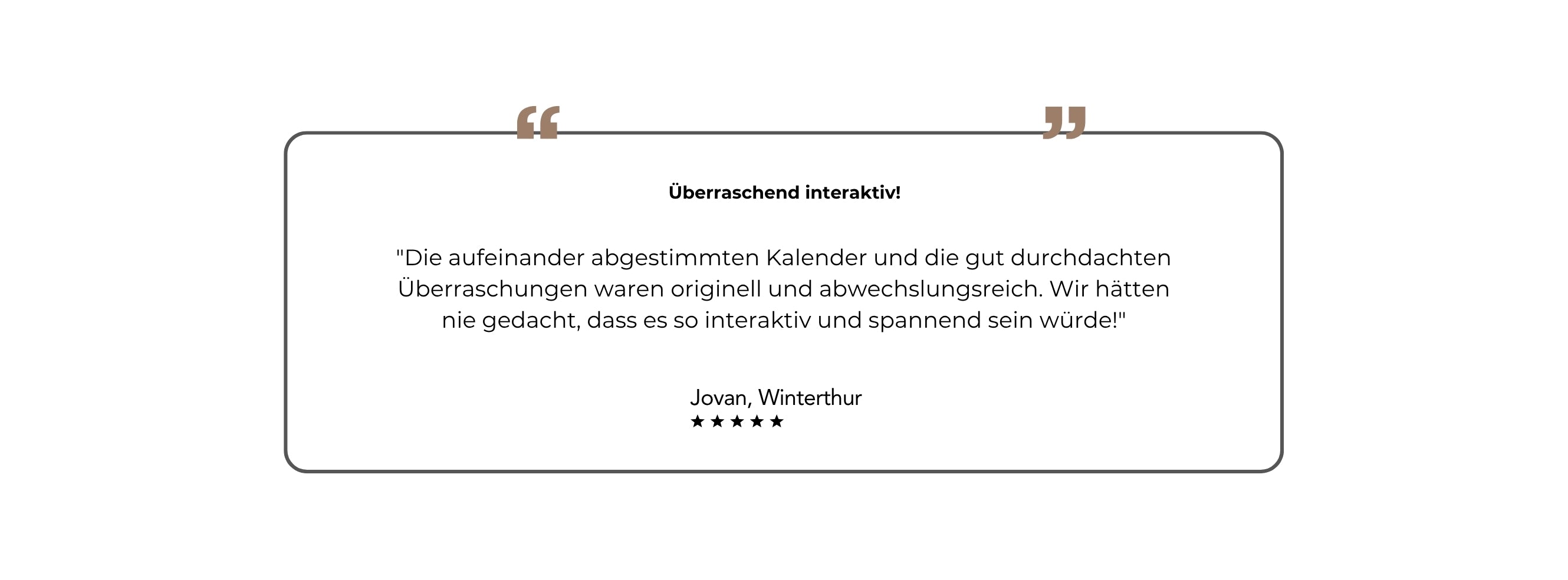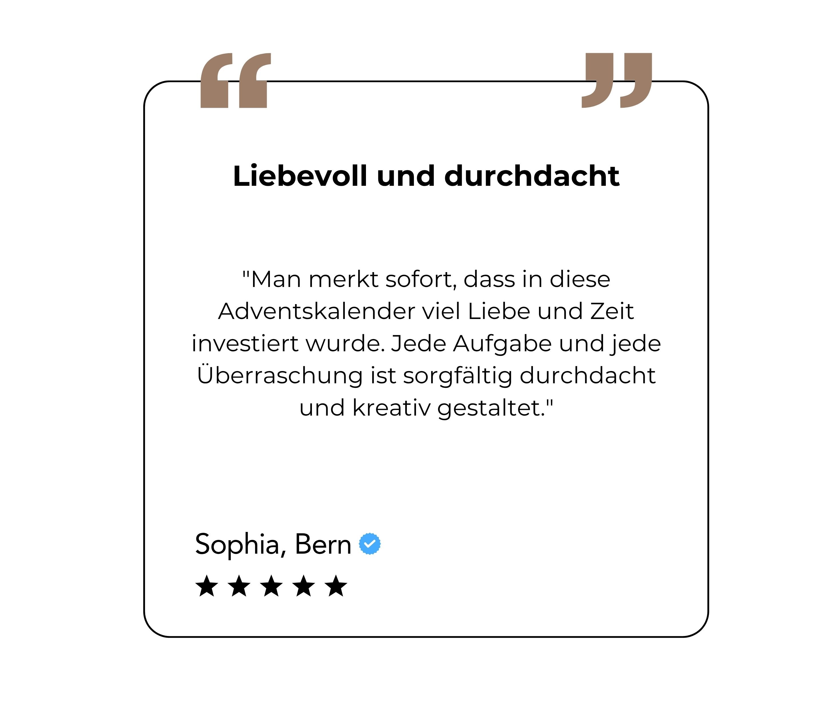 Der Paar-Adventskalender ist so konzipiert, dass die wichtigsten Dinge bereits organisiert sind. Ein kleiner Aufwand, aber eine grosse Wirkung. Unser Motto: Entspannt durch die Weihnachtszeit – riesige Freude bereiten.