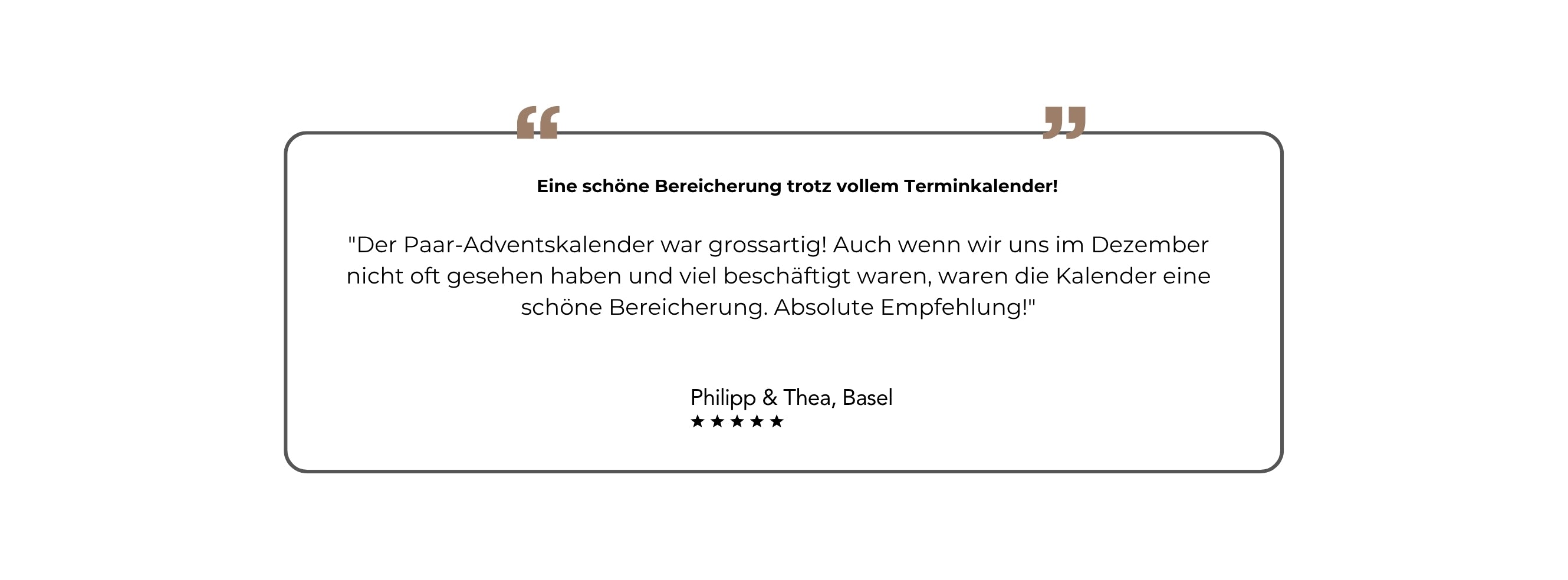 Der Paar-Adventskalender ist so konzipiert, dass die wichtigsten Dinge bereits organisiert sind. Ein kleiner Aufwand, aber eine grosse Wirkung. Unser Motto: Entspannt durch die Weihnachtszeit – riesige Freude bereiten.