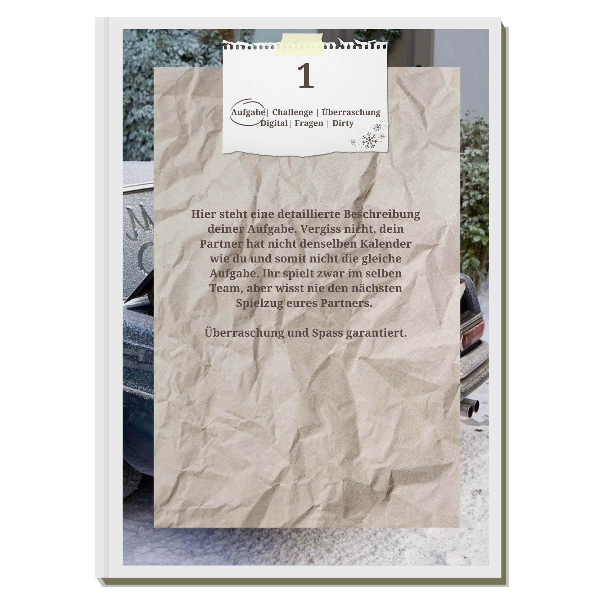 Jeden Tag bietet euch der Paar-Adventskalender eine Mischung aus Herausforderungen, romantischen Treffen, Dirty Adventures, tiefgründigen Gesprächsthemen und vielem mehr. Egal, ob ihr frisch verliebt seid oder schon lange zusammen, dieser Kalender vereint Herzen und schafft besondere Momente.
